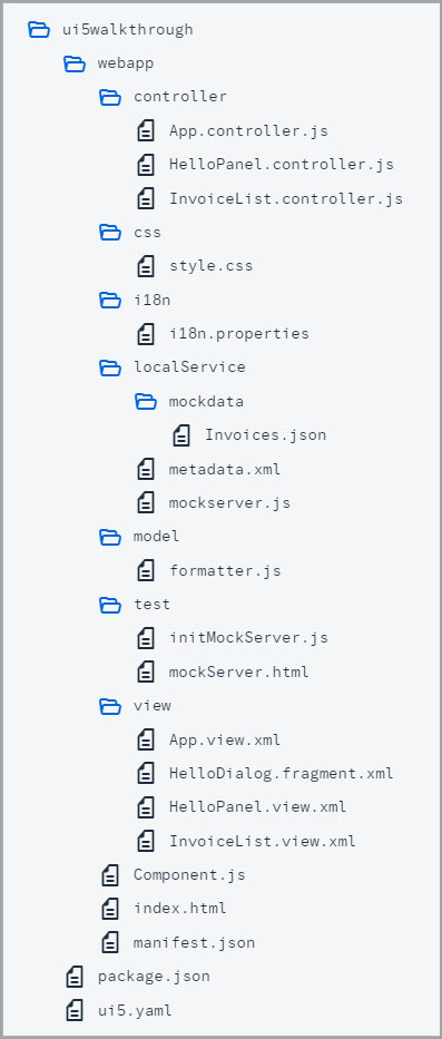 The new localService folder contains a metadata.xml service description file for OData, the mockserver.js file that simulates a real service with local data, and the mockdata subfolder that contains the local test data (Invoices.json).