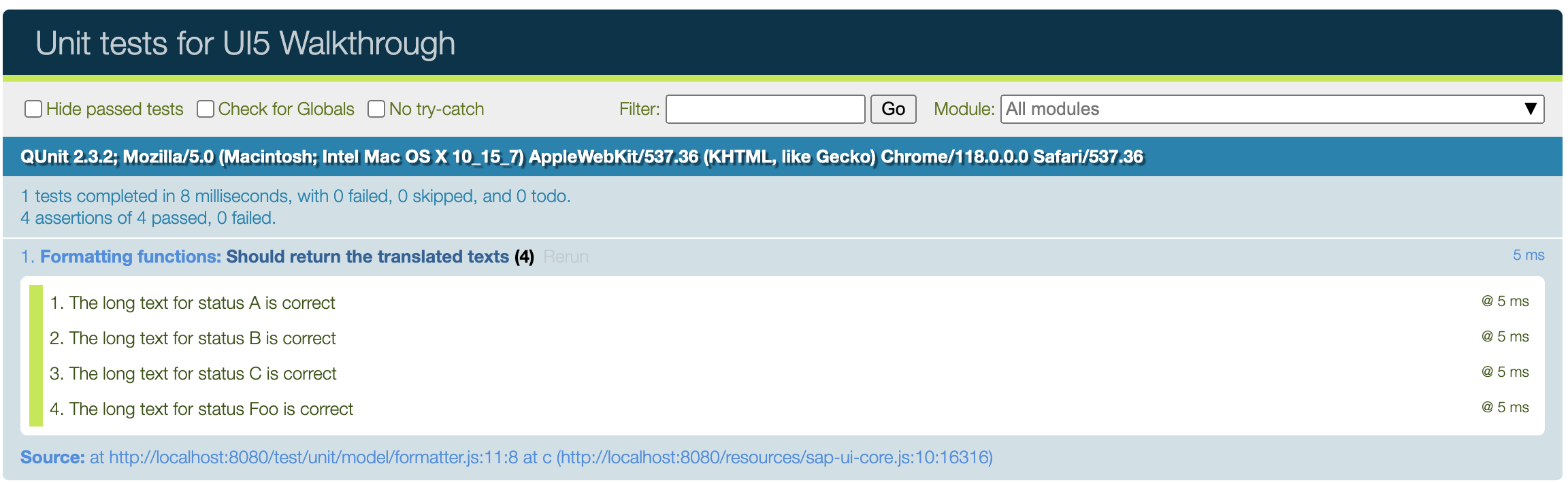 If we now open the webapp/test/testsuite.qunit.html file in the browser and select unit/unitTests, we should see our test running and verifying the formatter logic.